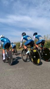 今回のチームTTは、10位以内入賞を目標に挑みました。しかし、15位と悔しい結果になりました。スタート後の1度目の復路で西口先輩がちぎれてしまい、そこからは、自分は絶対にちぎれてはならないという思いで走りましたが、ラスト5kmほどでちぎれてしまい、結果的に大きくタイムロスすることになりました。今回は、先頭交代の時のミスやTTバイクのフォームに慣れていなかったなど、TTの練習不足が顕著に出た大会でした。