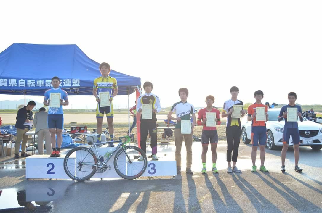 ここ最近のレースがひどい結果に終わってしまったので、今回はなんとしても結果を残したいと思いました。経験をもとに、前に出すぎず集団内で足をなるべく使わないようにする、という作戦で行きました。ローリングスタートでレースがスタートしました。雨で路面が濡れていた影響かペースはまぁまぁ楽でした。コーナーも濡れていたがそこまでは難易度が高くなかったのでそれほど苦労はしませんでしたが、カーボンホイールを使っていたためブレーキがなかなか効かなくてまぁまぁ怖かったです笑自分は集団の頭が見える位置、前から10~20m付近でずっとこなしていました。何度か前が詰まり前に出てしまいそうになっていましたが、今回は最後の方まで前に出ないと決めてたため我慢しました。中盤になると毎周回コーナーでコケたり膨らんで吹っ飛んでいく人が目の前にいたため、集中してかわしたり、集団からちぎれないよう他の人を使ったりして足をなるべく使わないように頑張りました。先頭を見ると、同じグループで出走した岸本がずっと前の方で展開していたのですごいなと思ってました。終盤に近ずいてくると、前に出るタイミングを伺いながら走りました。そこで同志社のニノの後輩の山住君がいたので、その番手で最後まで行ってやろうと思いました。最終周回に入るとペースが一気に上がっていき、自分はなんとか位置を下げないように食らいついて行きました。2つほど下がってしまいましたが、最終コーナーを8番手で前とそんなに差がないいい感じで曲がっていき、そこからスプリント!ってなりましたが、ペースアップで自分の脚はほぼ使い切った感じになって、一気に失速、前の7人とも一気に差が開き50m近く引き離されました。しかし、最後まで諦めずもがききってゴール。横を見ると大経の栗田さんが横にいましたが、ギリギリ先着。最初自分の順位がわからず、表彰で名前が呼ばれてはじめて8位入賞であることに気がつきました。自分も周りもまさか僕が入賞するとは思ってなかったでしょうね笑